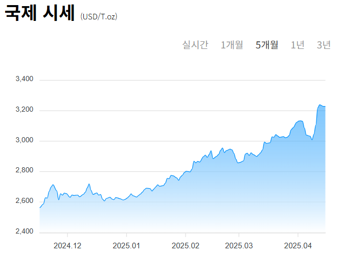 2025년 4월 기준, 국제 금 시세는 온스당 $3,200를 돌파하며 사상 최고치를 기록했습니다.